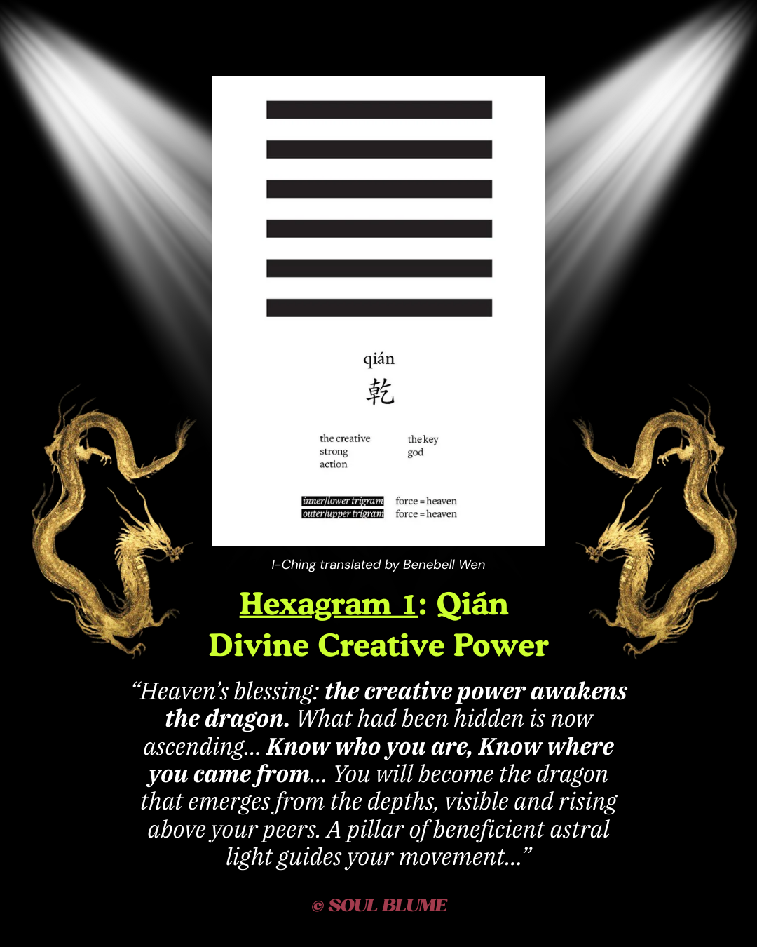 In the year of the dragon, the Soft Power founding team started studying the I-Ching, translated by Benebell Wen, also known as the “Book of Changes,” the sacred Chinese text of Taoist divination. Reading Hexagram 1 Qián of Divine Creative Power, pieced so many parts of me together.